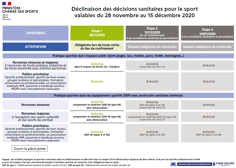 La reprise d'activités sportives pour les adultes aussi, ddevient possible... mais uniquement en plein air ! Pour voir les conditions à respecter, cliquer sur le logo du Ministère chargé des sports...REPRISE ACTIVITE SPORTIVE